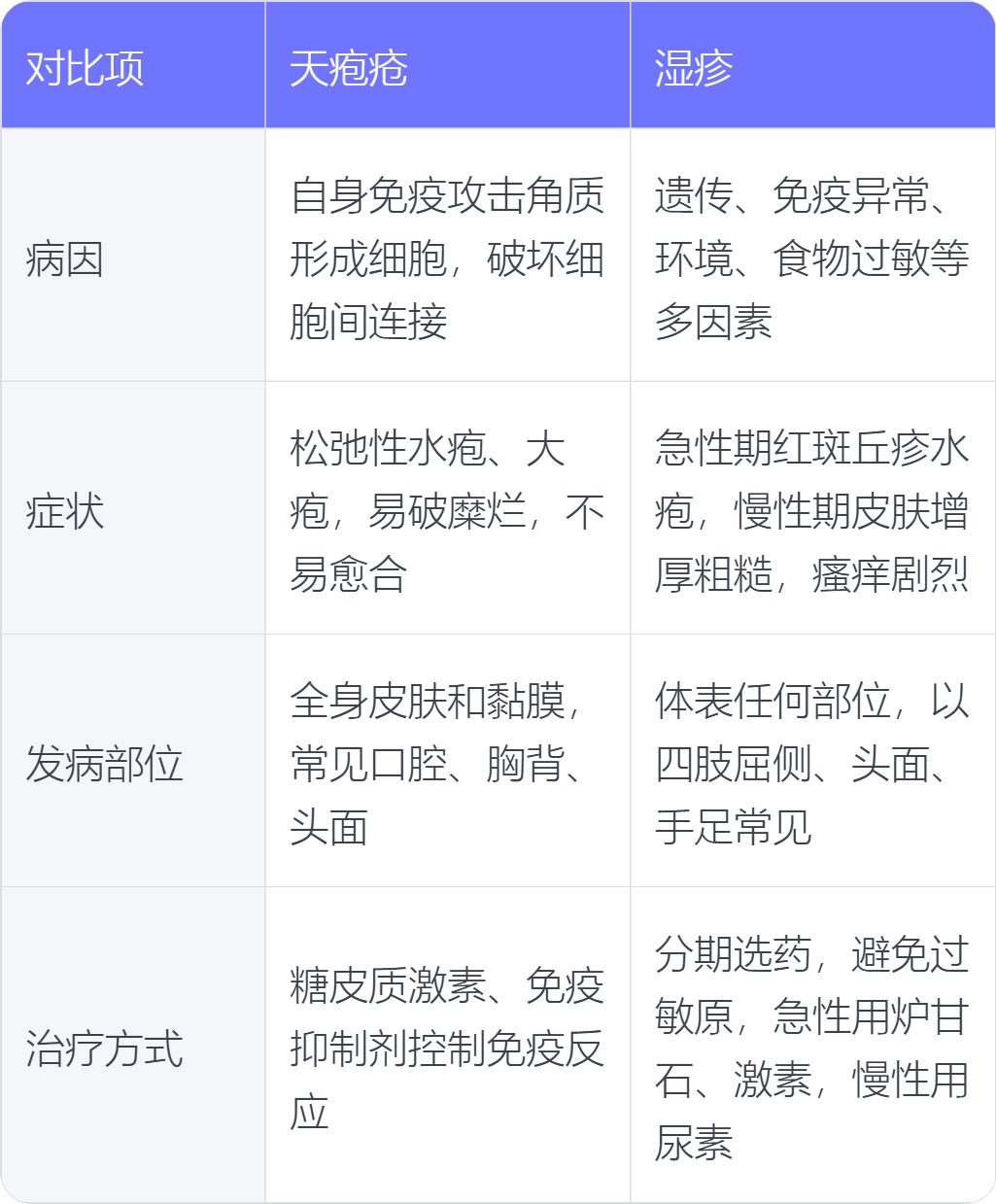 天疱疮与湿疹在病因、症状、发病部位、治疗方式上存在不同。