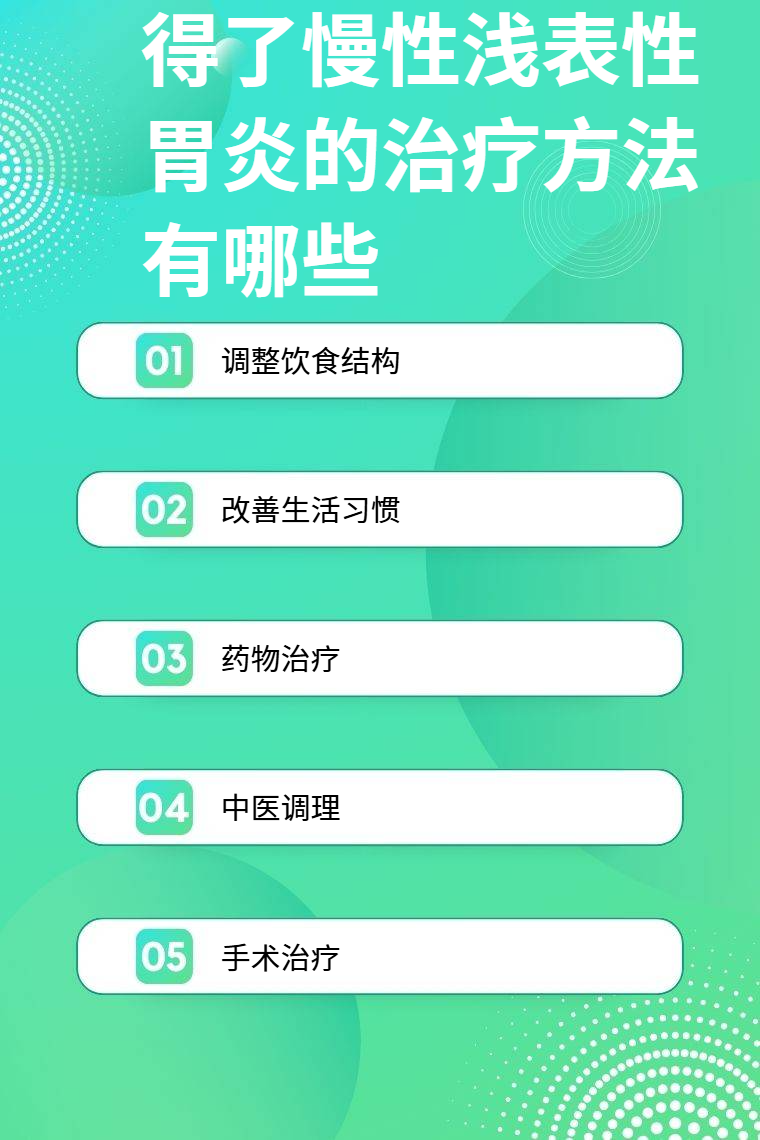 慢性浅表性胃炎的治疗方法有调整饮食结构、改善生活习惯、药物治疗、中医调理、手术治疗等。