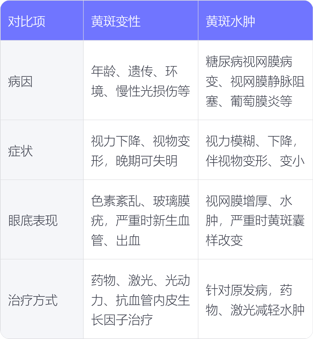 黄斑变性和黄斑水肿在病因、症状、眼底表现、治疗方式上存在不同。