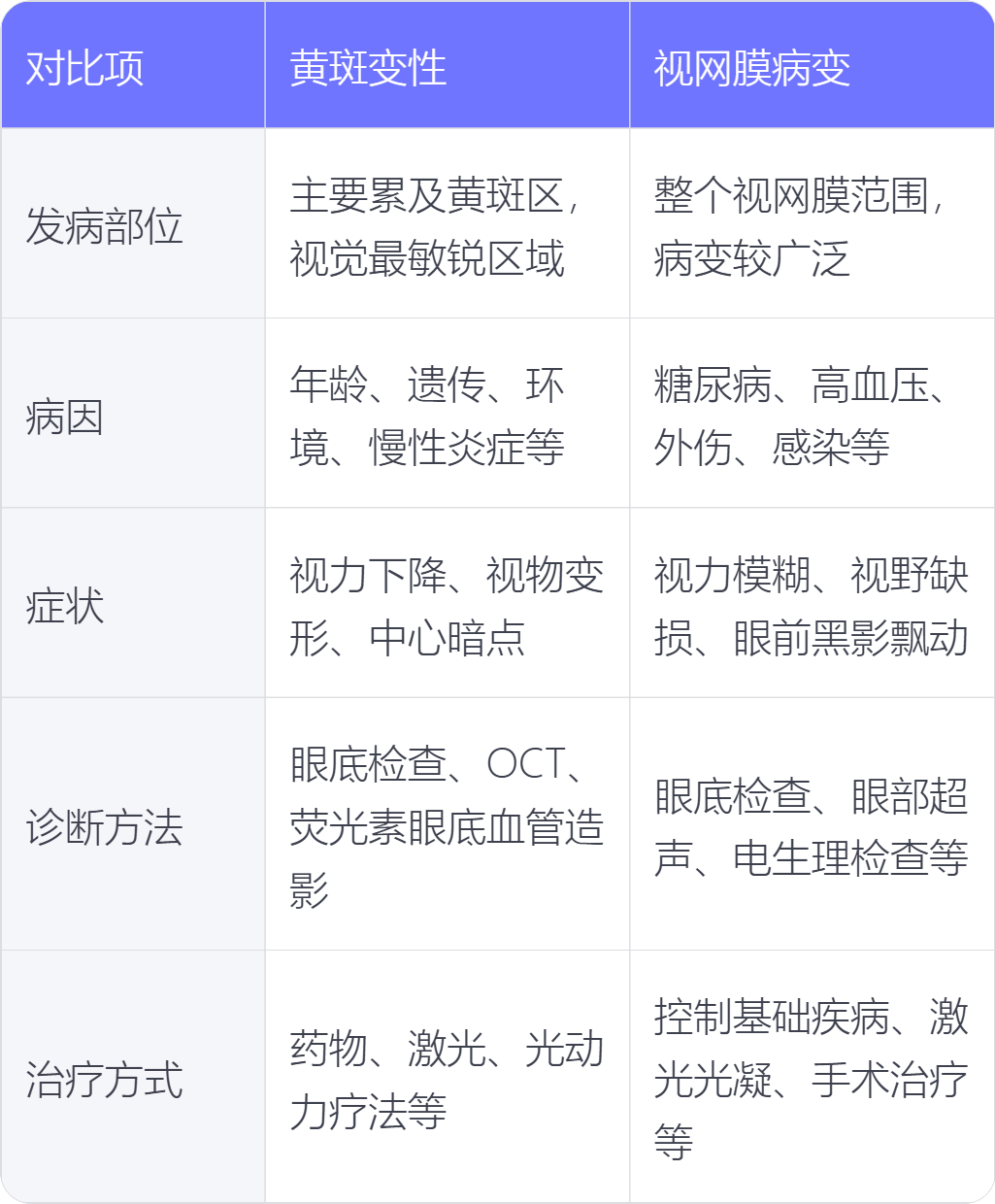 黄斑变性和视网膜病变在发病部位、病因、症状、诊断方法、治疗方式上存在不同。