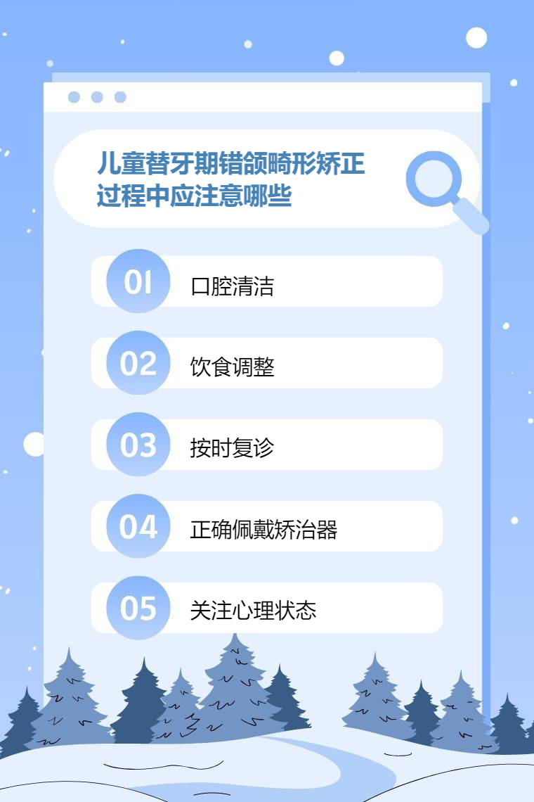儿童替牙期错颌畸形矫正过程中应注意口腔清洁、饮食调整、按时复诊、正确佩戴矫治器、关注心理状态等。