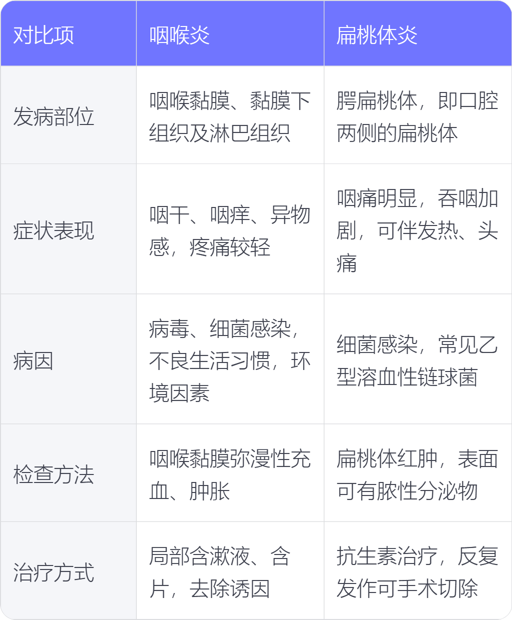 5. 治疗方式:咽喉炎治疗多采用局部用药,如含漱液、含片等,同时需去除诱发因素;扁桃体炎治疗以抗生素为主,根据病情严重程度选择口服或静脉用药,若扁桃体炎反复发作,可考虑手术切除扁桃体。