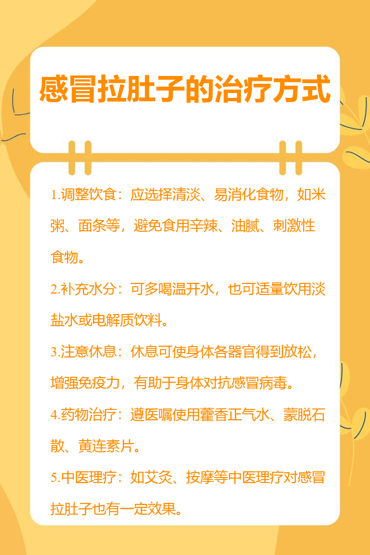 感冒拉肚子可通过调整饮食、补充水分、注意休息、药物治疗、中医理疗等方式进行治疗。