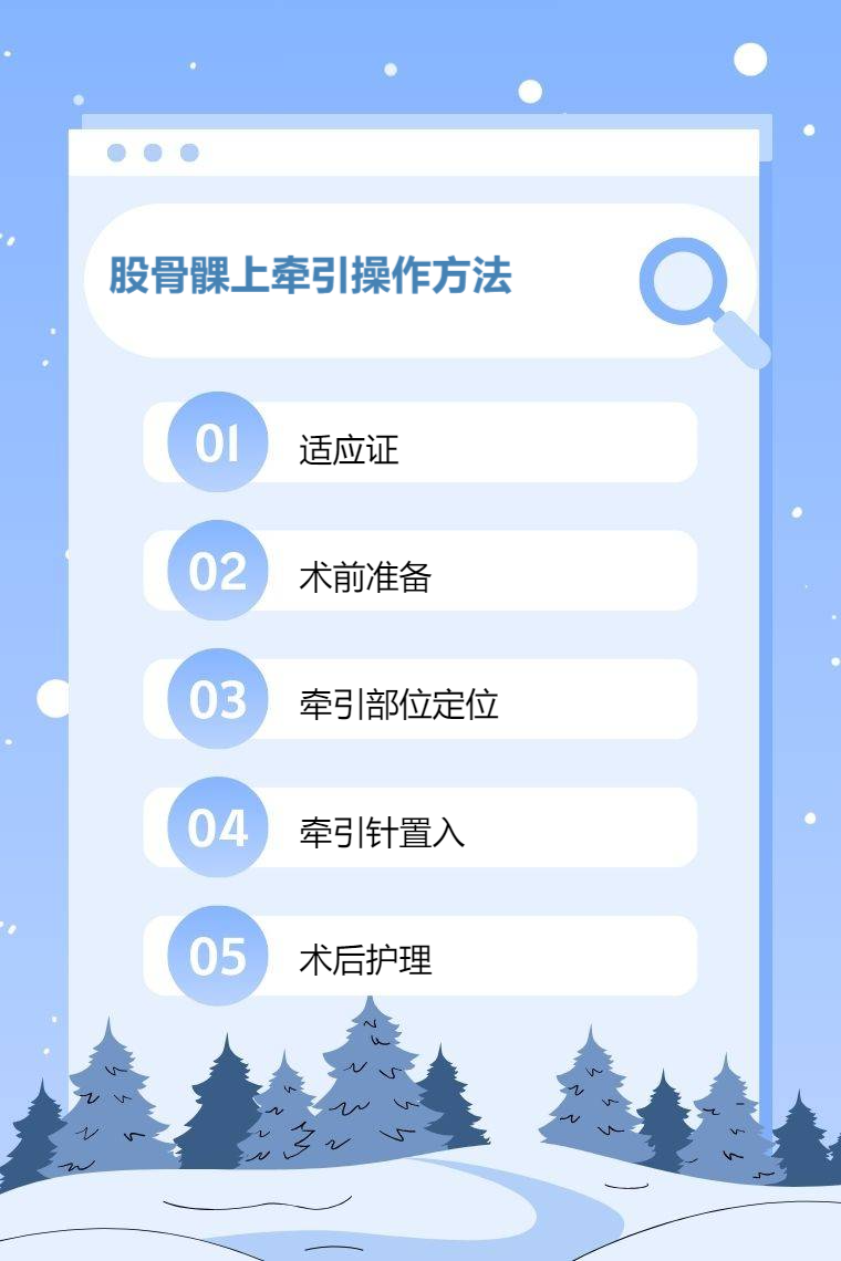 股骨髁上牵引操作方法包含适应证、术前准备、牵引部位定位、牵引针置入、术后护理等。