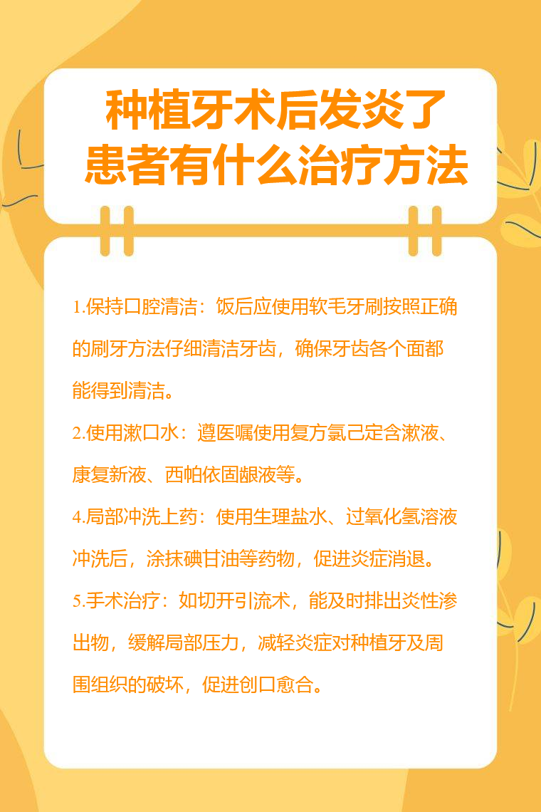 种植牙术后发炎可通过保持口腔清洁、使用漱口水、服用抗生素、局部冲洗上药、手术治疗等方法来应对。
