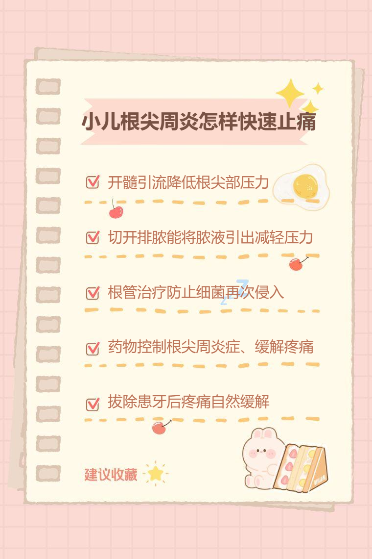 小儿根尖周炎快速止痛可通过开髓引流、切开排脓、根管治疗、药物治疗、拔牙等方法。