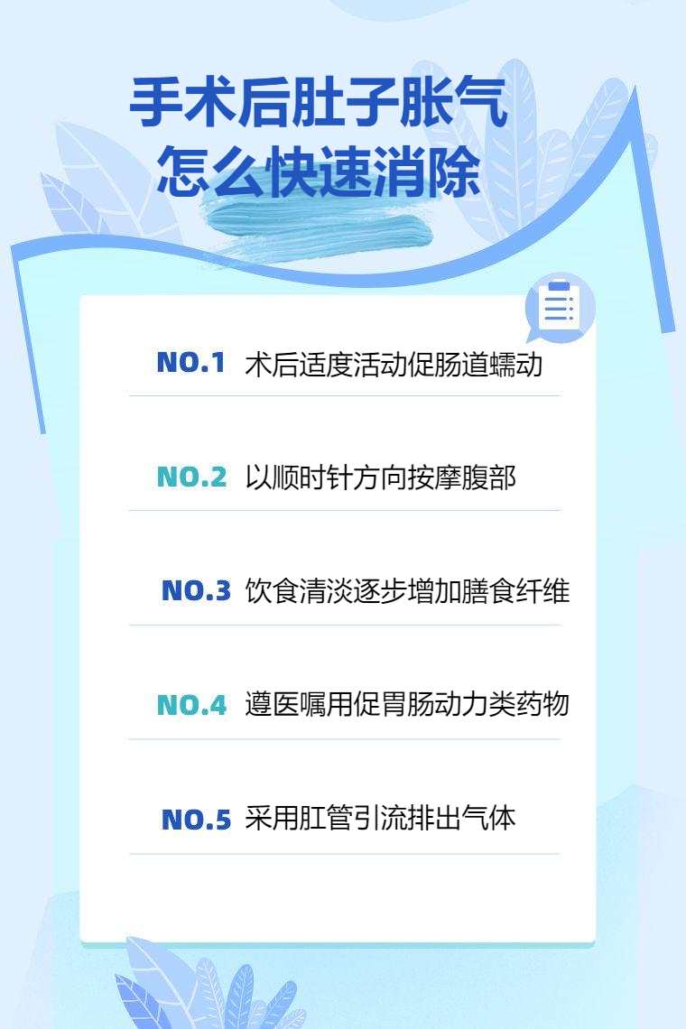 手术后肚子胀气可通过适当活动、腹部按摩、饮食调整、药物治疗、肛管排气等方法快速消除。