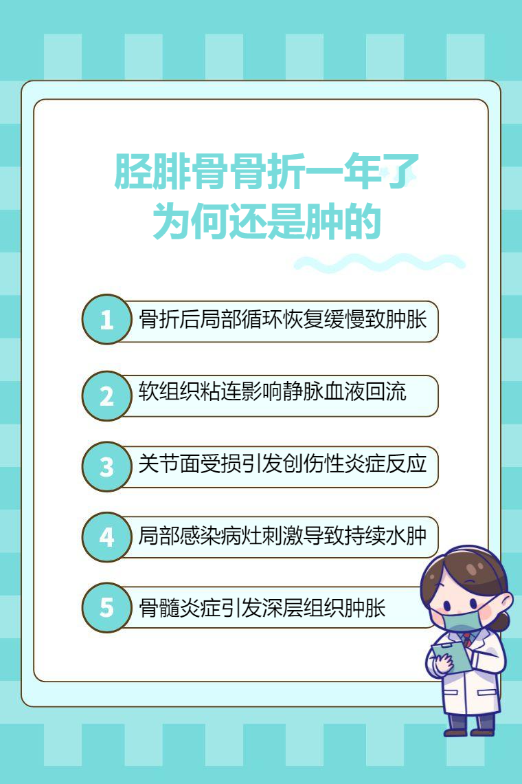 胫腓骨骨折一年后仍肿可能是局部血液循环未恢复、软组织粘连、创伤性关节炎、感染、骨髓炎等。