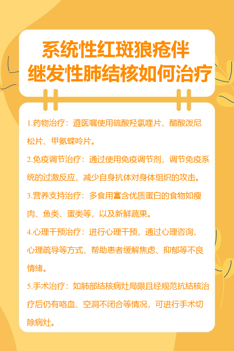 系统性红斑狼疮伴继发性肺结核的治疗方法包括药物治疗、免疫调节治疗、营养支持治疗、心理干预治疗、手术治疗等。
