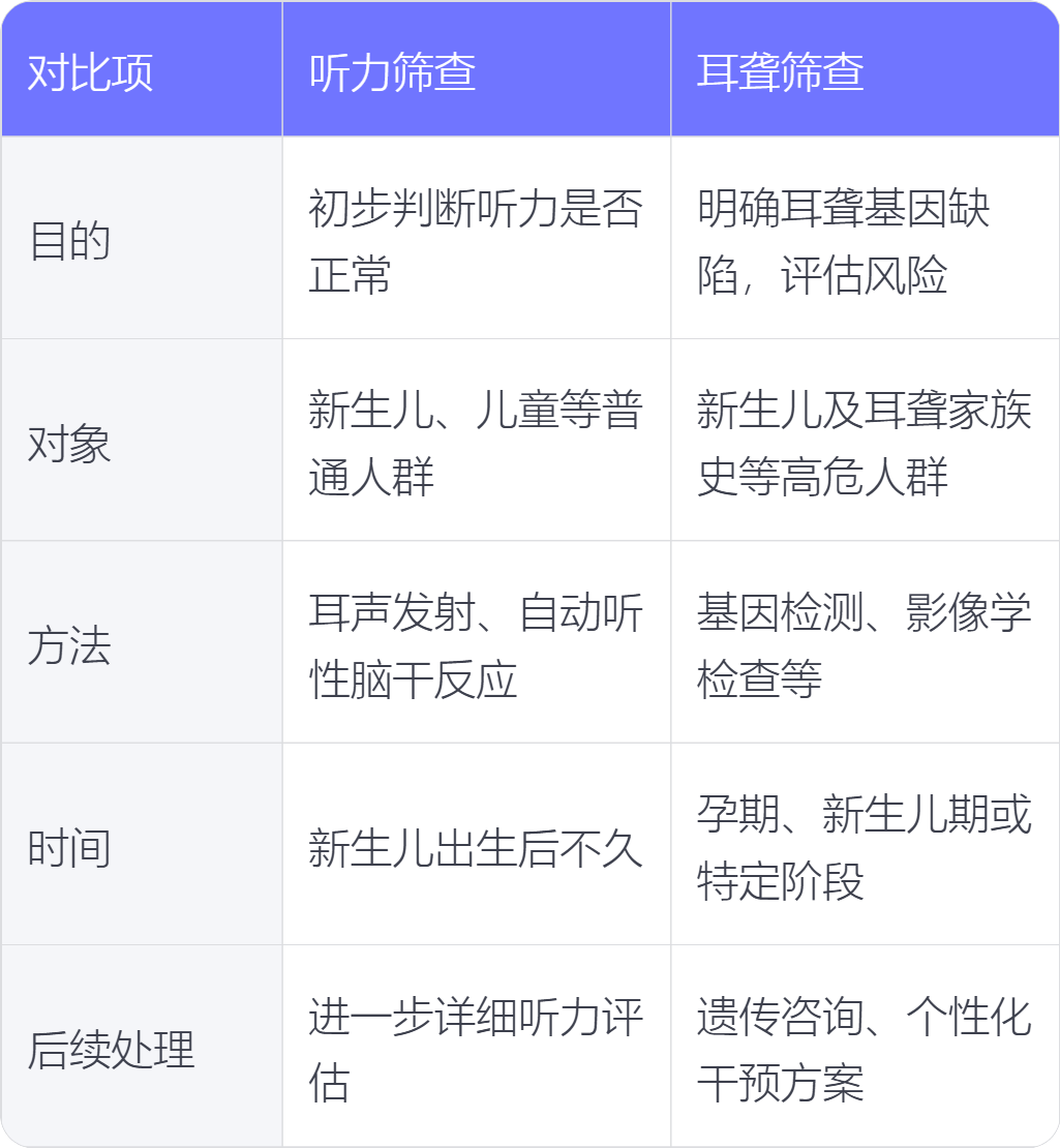 听力筛查和耳聋筛查在目的、对象、方法、时间、后续处理方面存在不同。