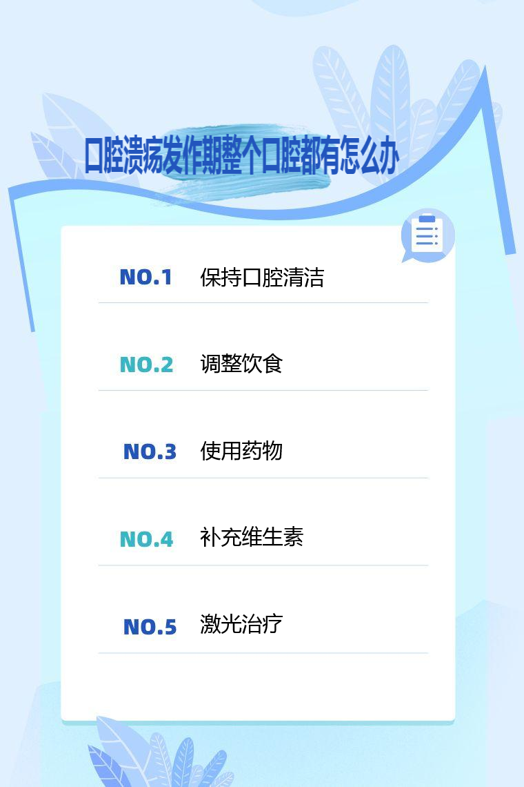 口腔溃疡发作期整个口腔都有可通过保持口腔清洁、调整饮食、使用药物、补充维生素、激光治疗等方法来应对。
