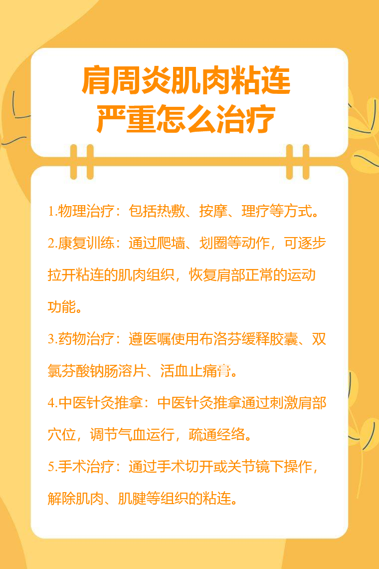 肩周炎肌肉粘连严重可通过物理治疗、康复训练、药物治疗、中医针灸推拿、手术治疗等方法来改善。