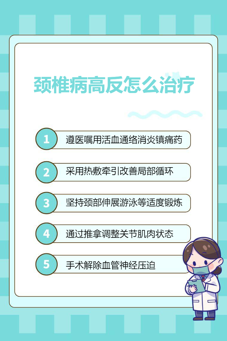 颈椎病高反的治疗方法有药物治疗、物理治疗、运动疗法、中医推拿、手术治疗等。
