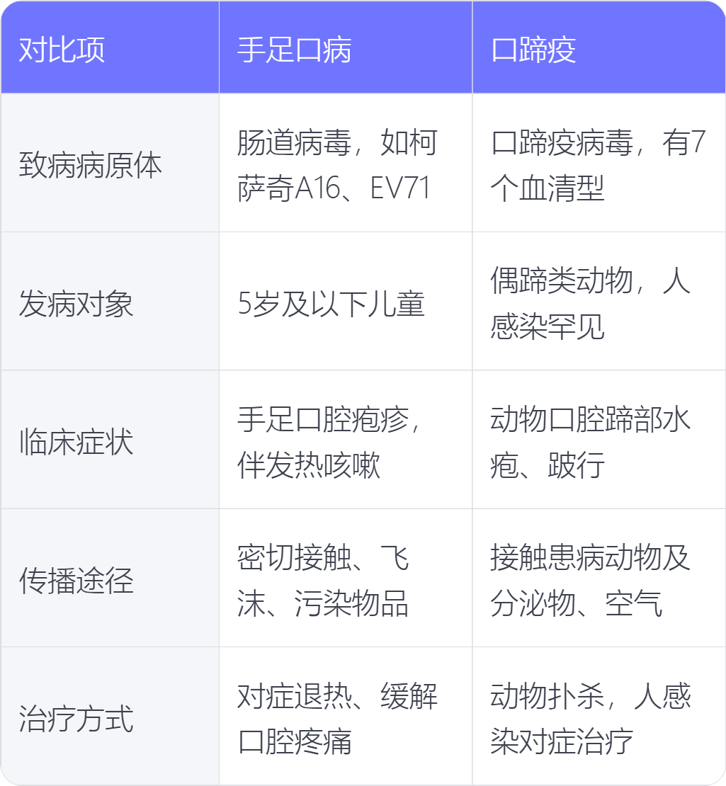 手足口病与口蹄疫在致病病原体、发病对象、临床症状、传播途径、治疗方式上存在不同。