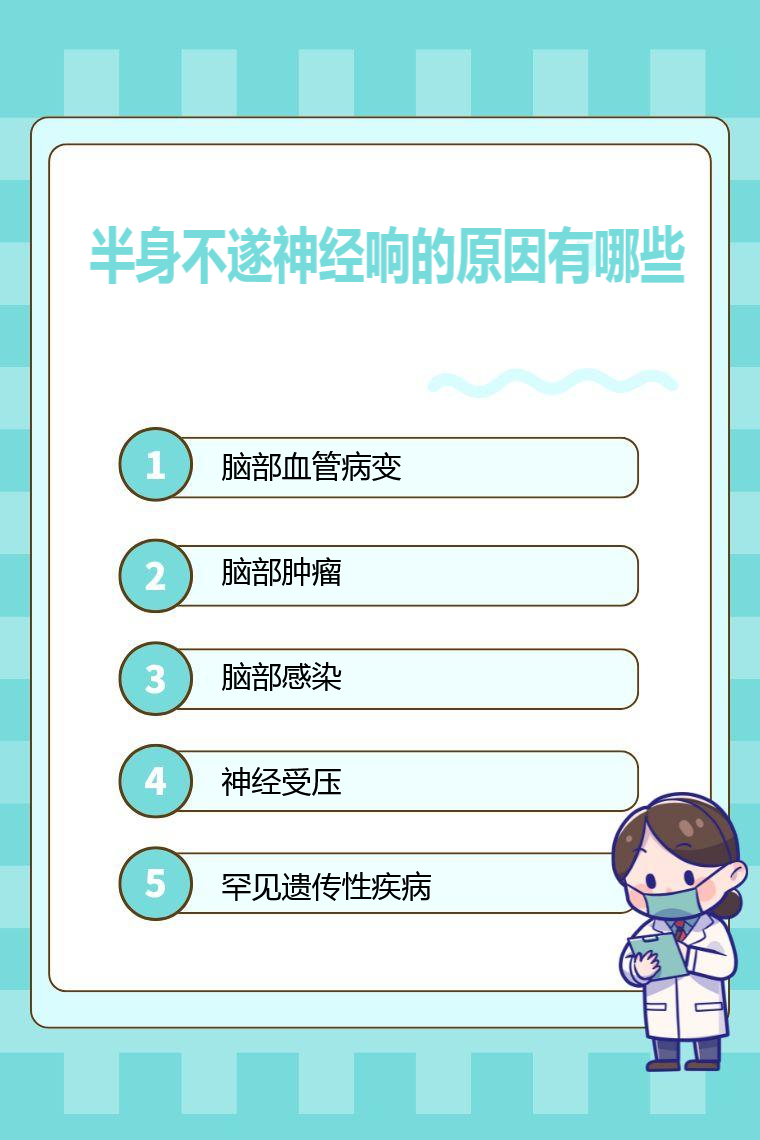 半身不遂神经响的原因有脑部血管病变、脑部肿瘤、脑部感染、神经受压、罕见遗传性疾病等。