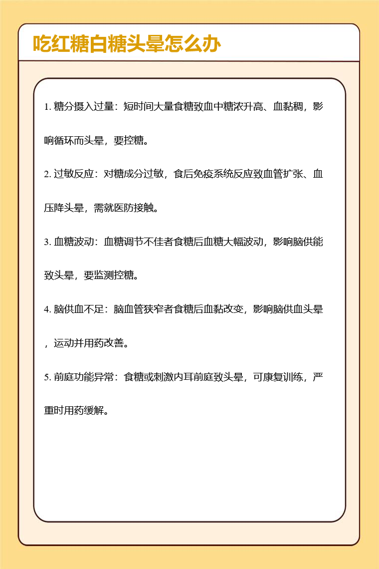 吃红糖白糖头晕可能是糖分摄入过量、过敏反应、血糖波动、脑供血不足、前庭功能异常等因素,需要针对病因治疗,可采取的方法有控制糖分摄入、远离过敏原、监测血糖、改善脑部供血、进行前庭康复训练等。