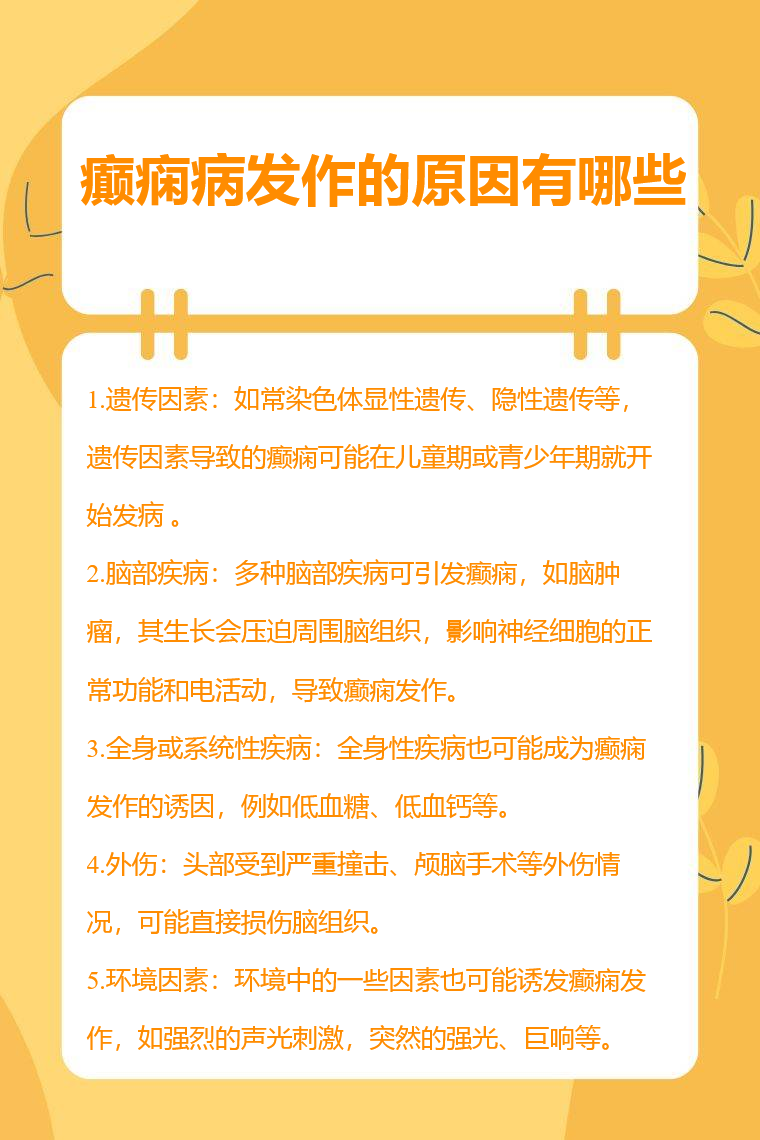 癫痫病发作的原因有遗传因素、脑部疾病、全身或系统性疾病、外伤、环境因素等。