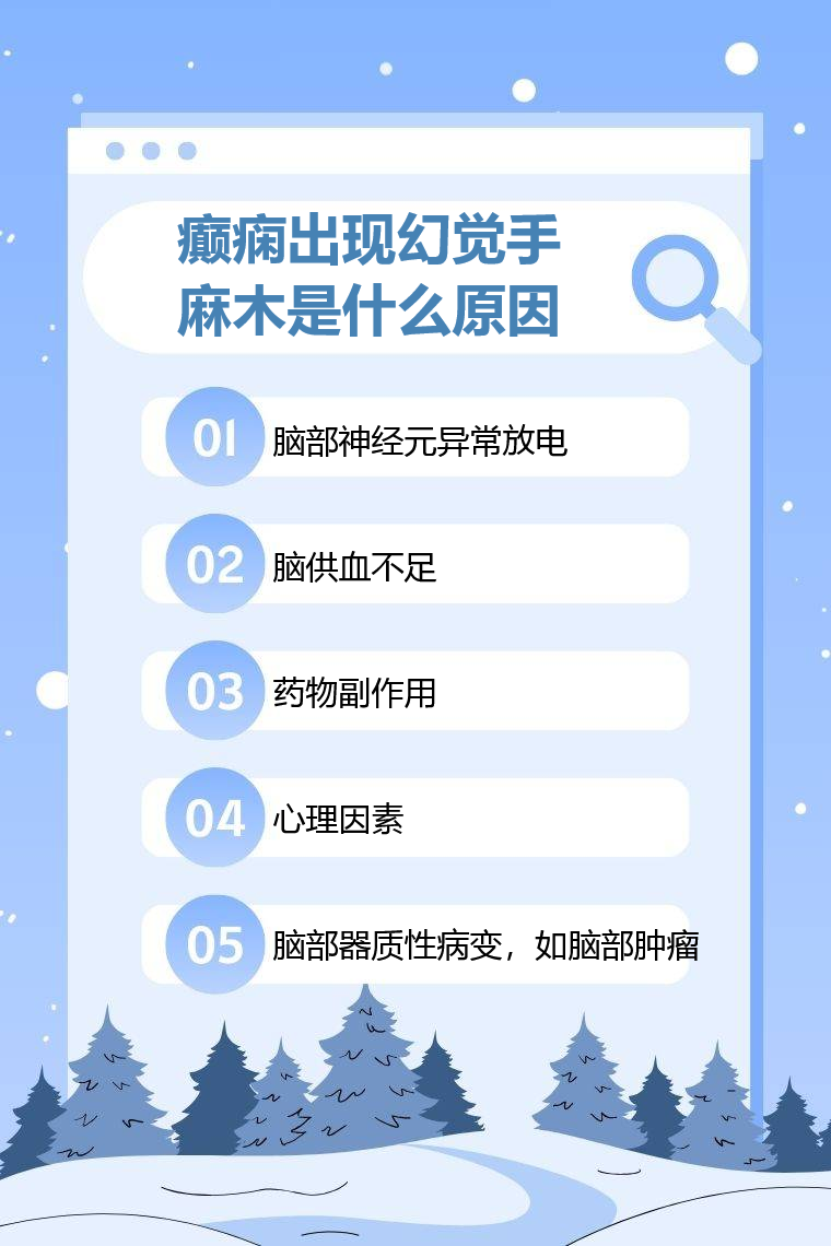 癫痫患者出现幻觉手麻木的原因常见到罕见依次有脑部神经元异常放电、脑供血不足、药物副作用、心理因素、脑部器质性病变等。