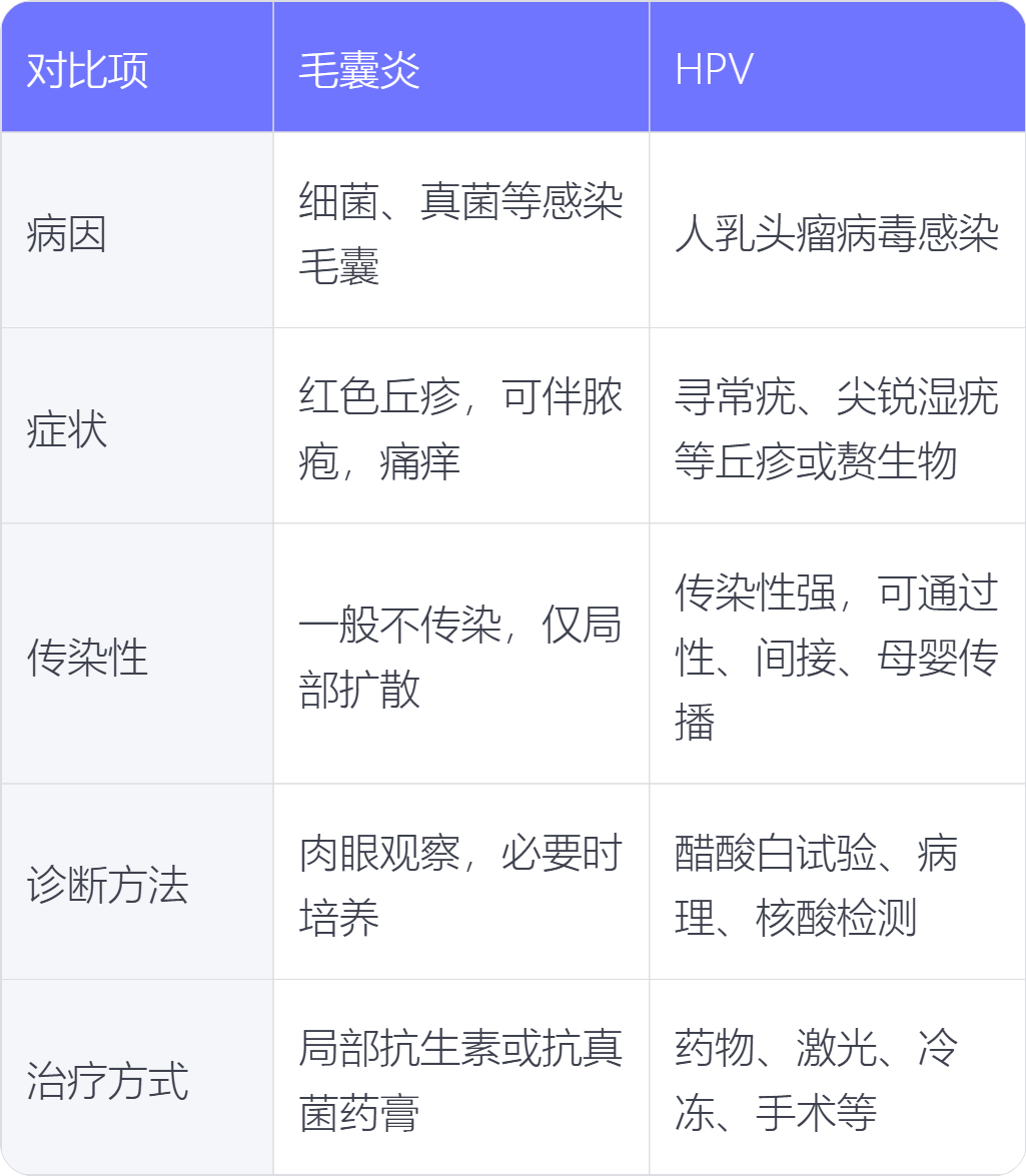 毛囊炎和HPV在病因、症状、传染性、诊断方法、治疗方式上存在不同。