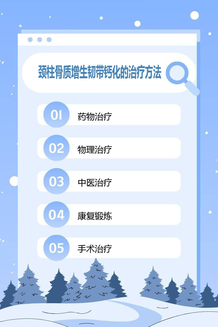 颈椎骨质增生韧带钙化的治疗方法有药物治疗、物理治疗、中医治疗、康复锻炼、手术治疗等。