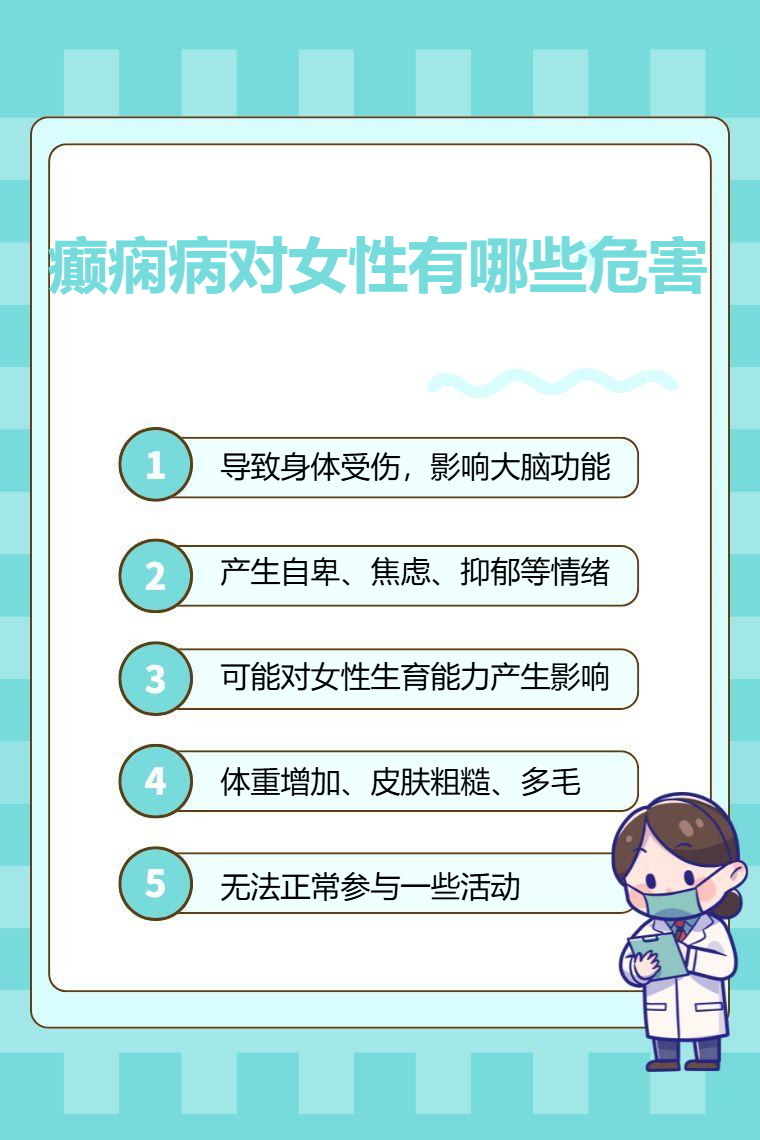 癫痫病对女性的危害包括生理健康、心理健康、生育、外貌形象、生活质量等。