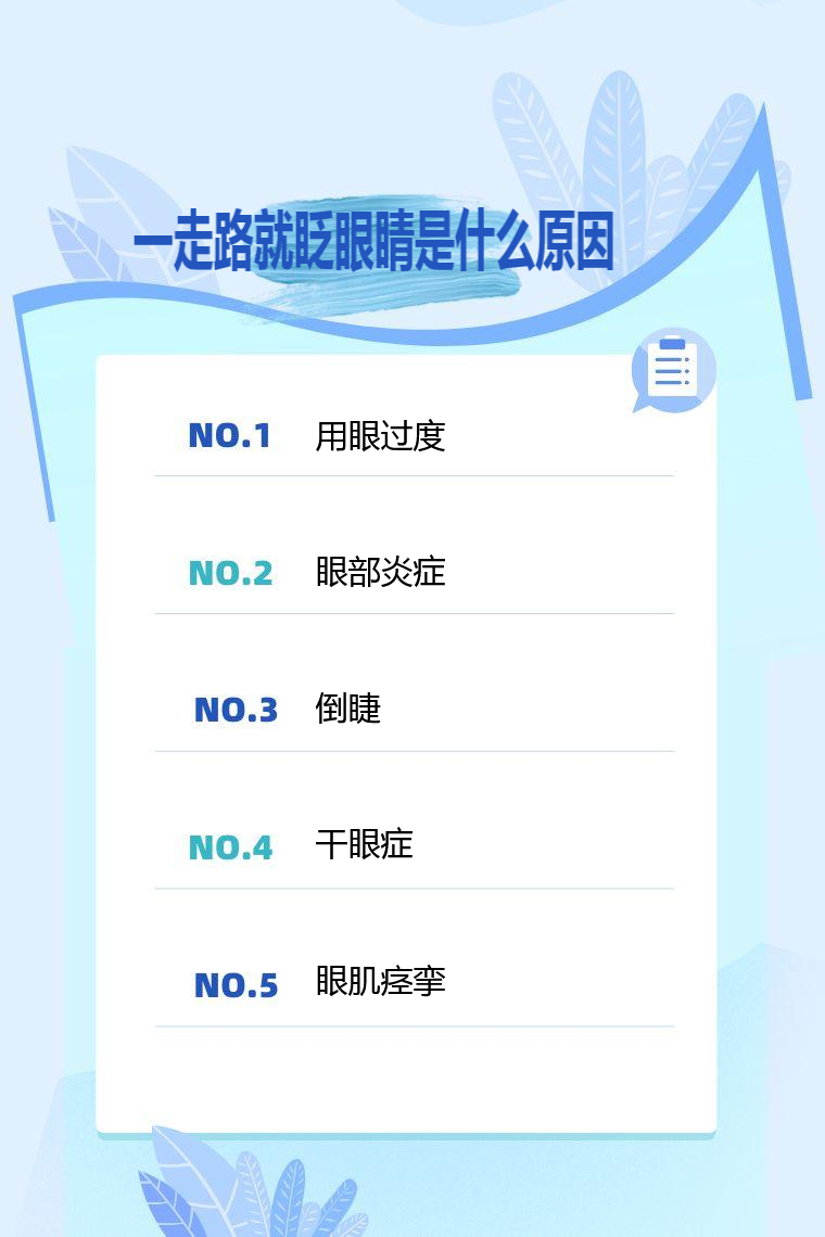 1. 用眼过度:长时间使用电子设备、阅读等导致用眼疲劳,眼部肌肉紧张,走路时易出现眨眼现象。减少用眼时间,定时休息,眺望远处,多做眼保健操,可缓解症状。