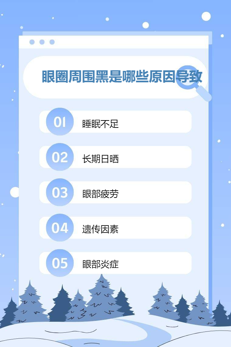 眼圈周围黑常见原因有睡眠不足、长期日晒、眼部疲劳、遗传因素、眼部炎症等。