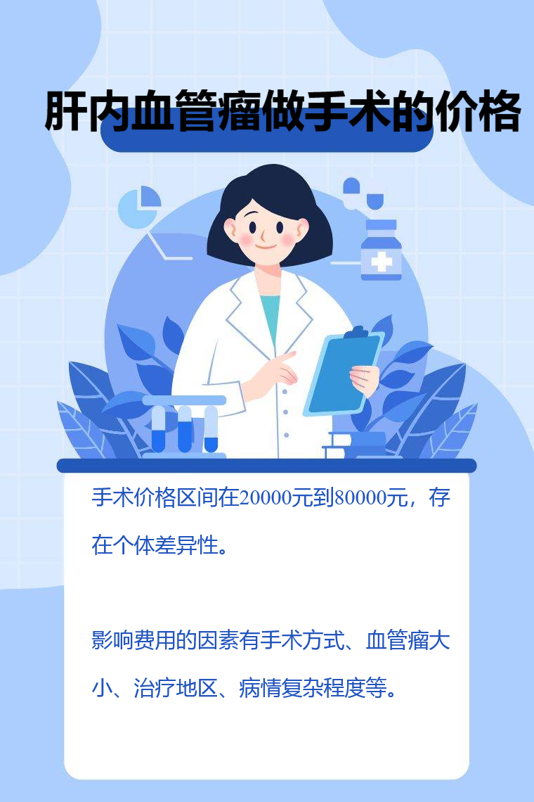 肝内血管瘤做手术的价格因多种因素而异。一般来说,手术价格区间在20000元到80000元,存在个体差异性。影响费用的因素有手术方式、血管瘤大小、治疗地区、病情复杂程度等。