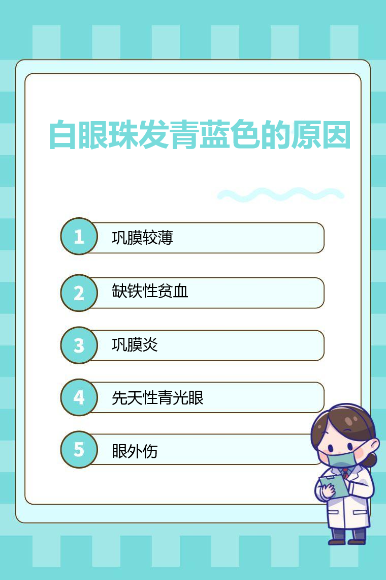 白眼珠发青蓝色常见原因有巩膜较薄、缺铁性贫血、巩膜炎、先天性青光眼、眼外伤等。