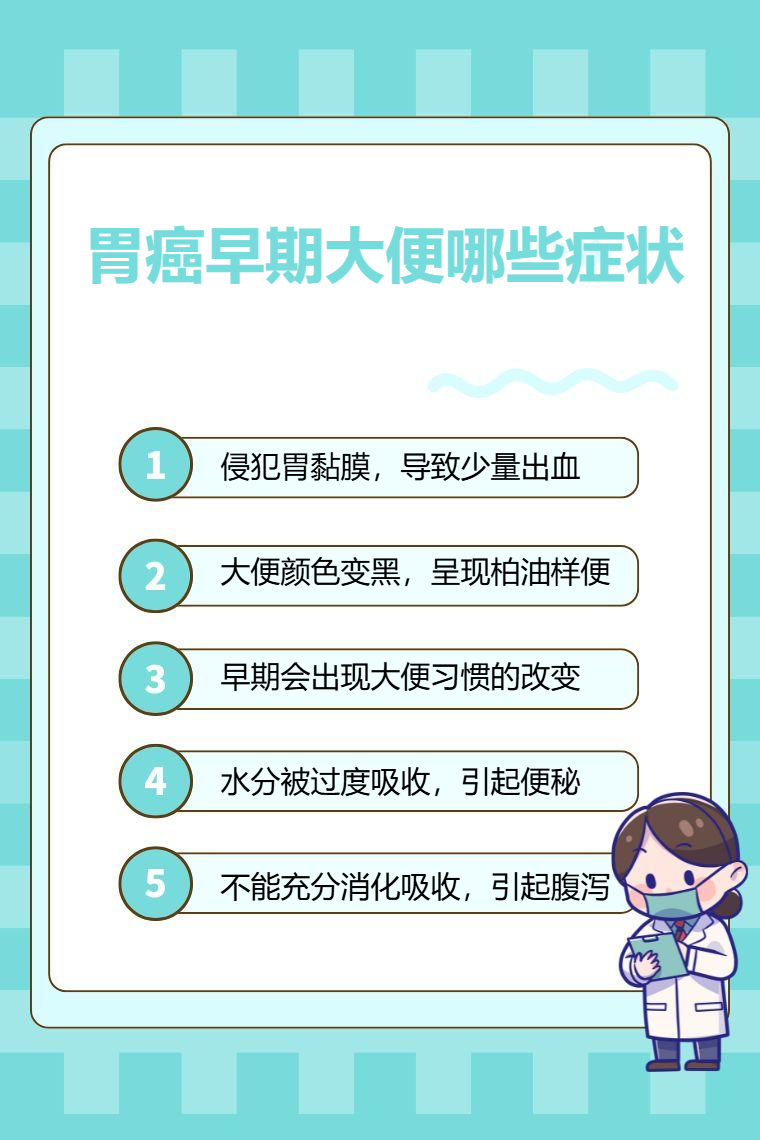 胃癌早期大便可能出现大便潜血阳性、黑便、大便习惯改变、便秘、腹泻等症状。