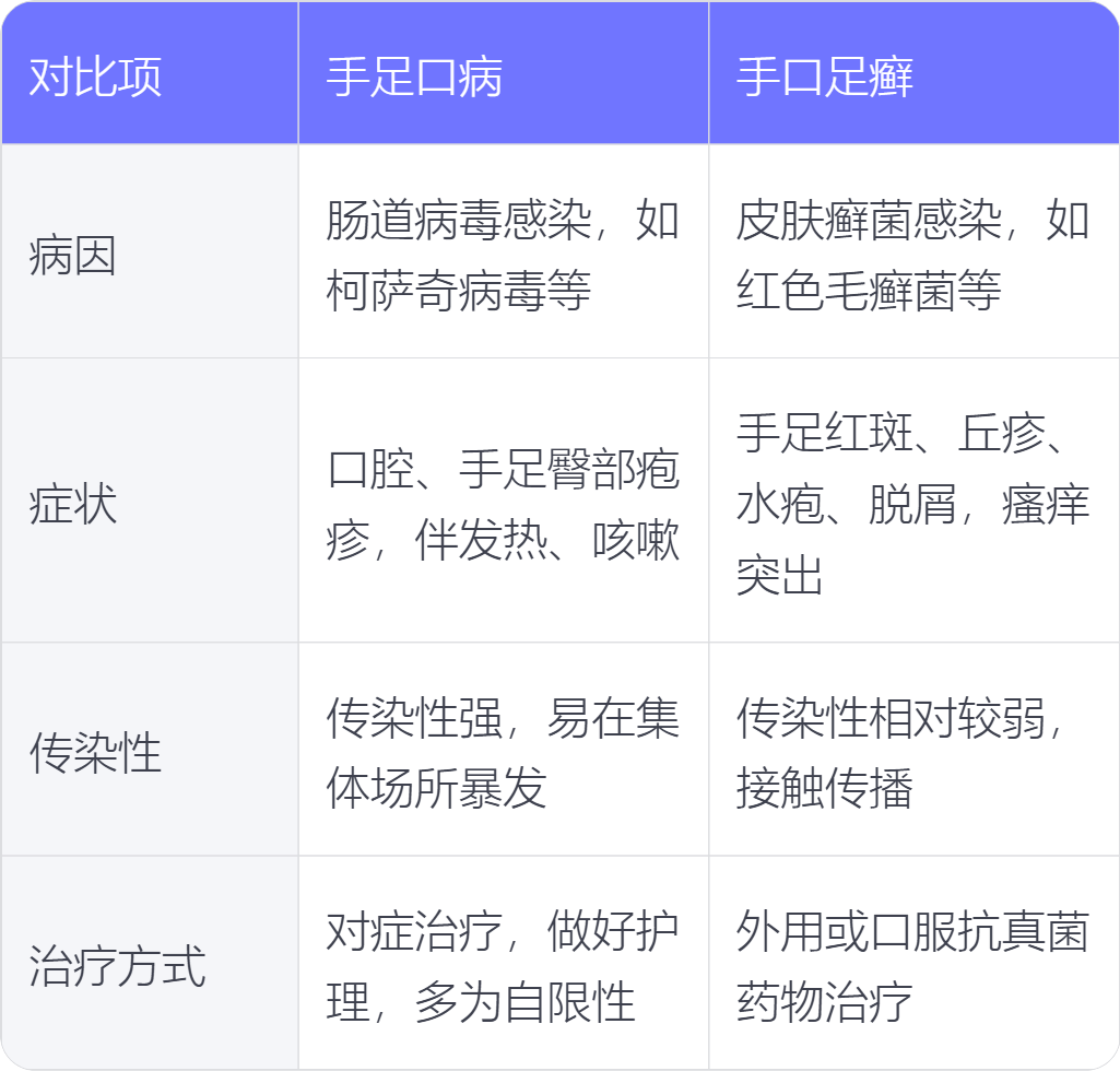 手足口病和手口足癣在病因、症状、传染性、治疗方式上存在不同。