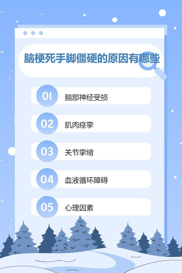 脑梗死手脚僵硬的原因有脑部神经受损、肌肉痉挛、关节挛缩、血液循环障碍、心理因素等。