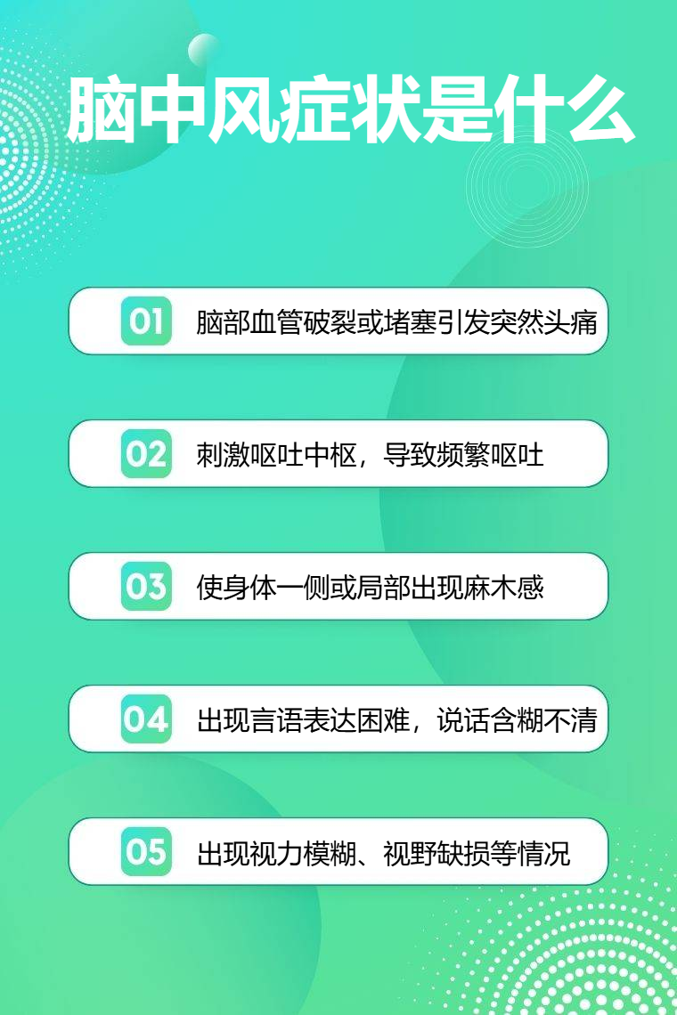 脑中风症状包括头痛、呕吐、肢体麻木、言语不清、视力障碍等。