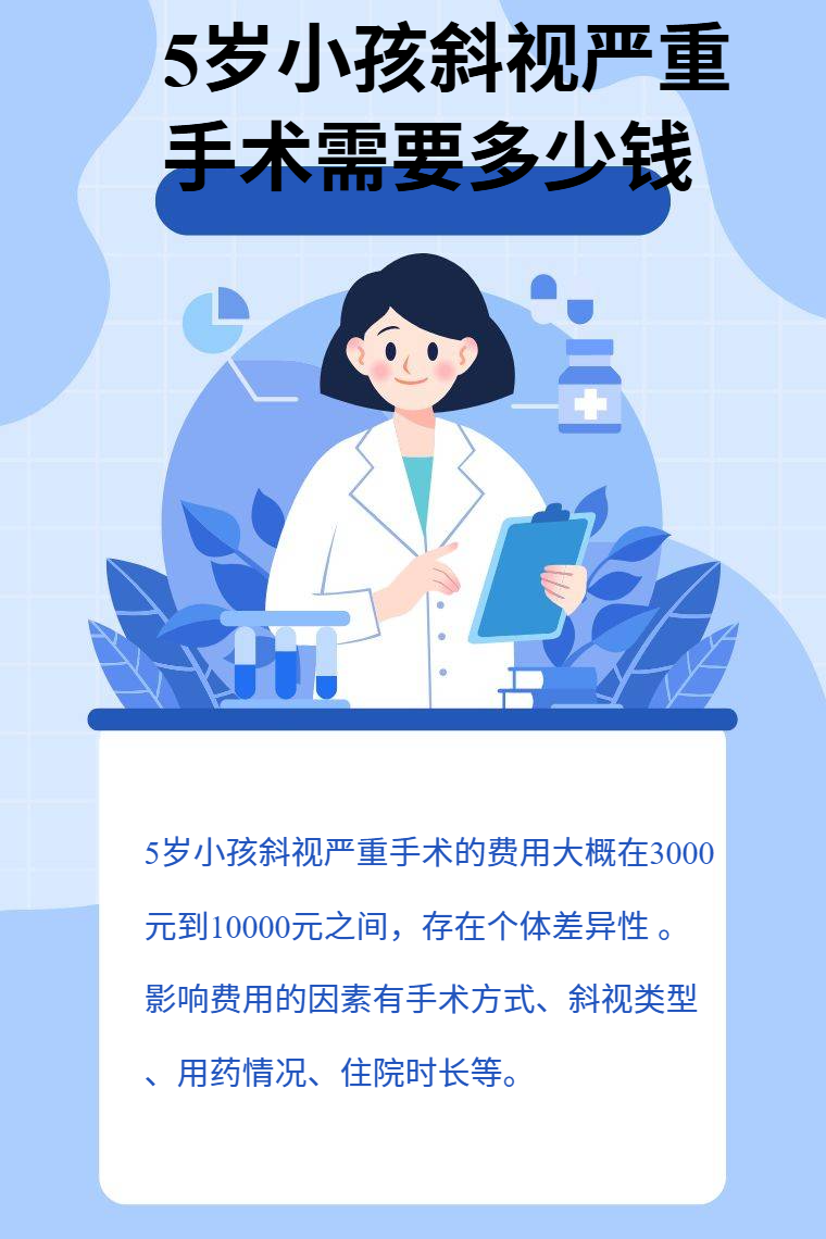 5岁小孩斜视严重手术的费用大概在3000元到10000元之间,存在个体差异性 。影响费用的因素有手术方式、斜视类型、用药情况、住院时长等。