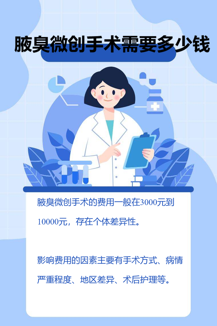 腋臭微创手术的费用一般在3000元到10000元,存在个体差异性。影响费用的因素主要有手术方式、病情严重程度、地区差异、术后护理等。