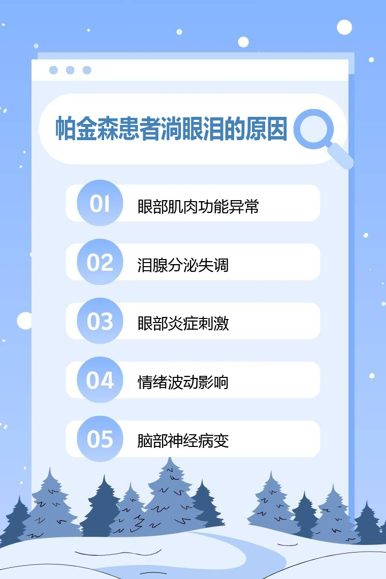 帕金森患者淌眼泪的原因包括眼部肌肉功能异常、泪腺分泌失调、眼部炎症刺激、情绪波动影响、脑部神经病变等。