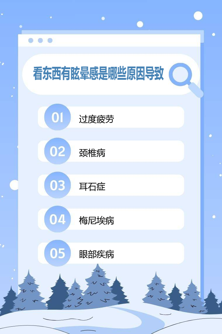 看东西有眩晕感可能由过度疲劳、颈椎病、耳石症、梅尼埃病、眼部疾病等导致。