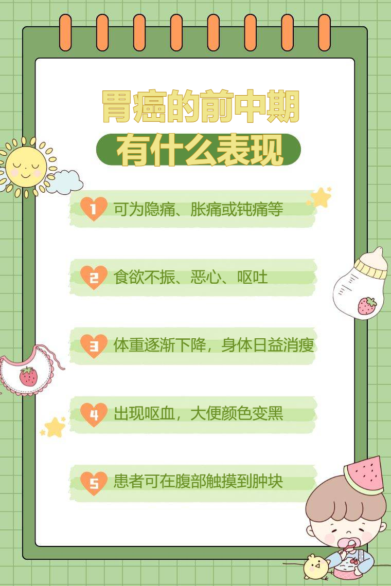 胃癌前中期表现有上腹部疼痛、消化不良、体重减轻、呕血黑便、腹部肿块等。