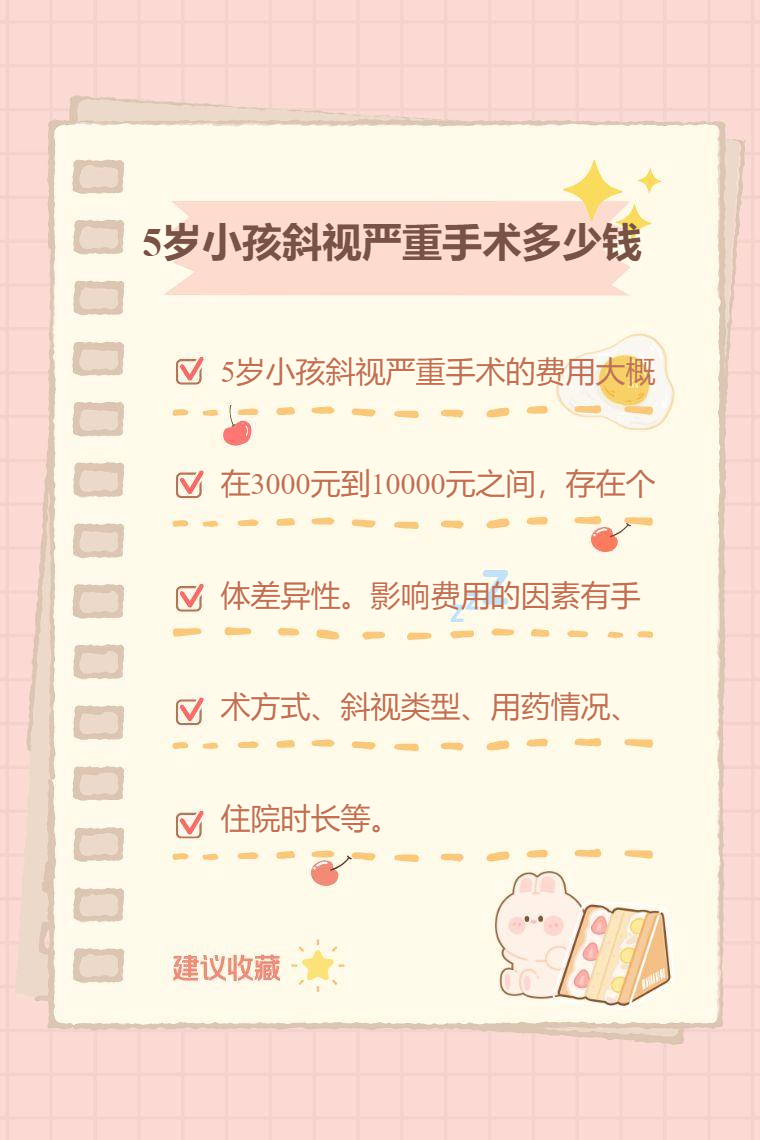 5岁小孩斜视严重手术的费用大概在3000元到10000元之间,存在个体差异性。影响费用的因素有手术方式、斜视类型、用药情况、住院时长等。