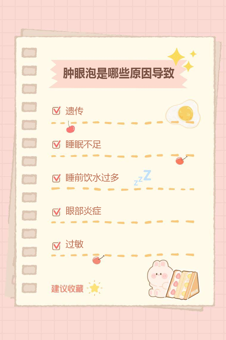 5. 过敏:接触花粉、化妆品等过敏原,眼部发生过敏反应,出现肿眼泡。避免接触过敏原,症状严重时可口服抗过敏药物,如氯雷他定等缓解症状。