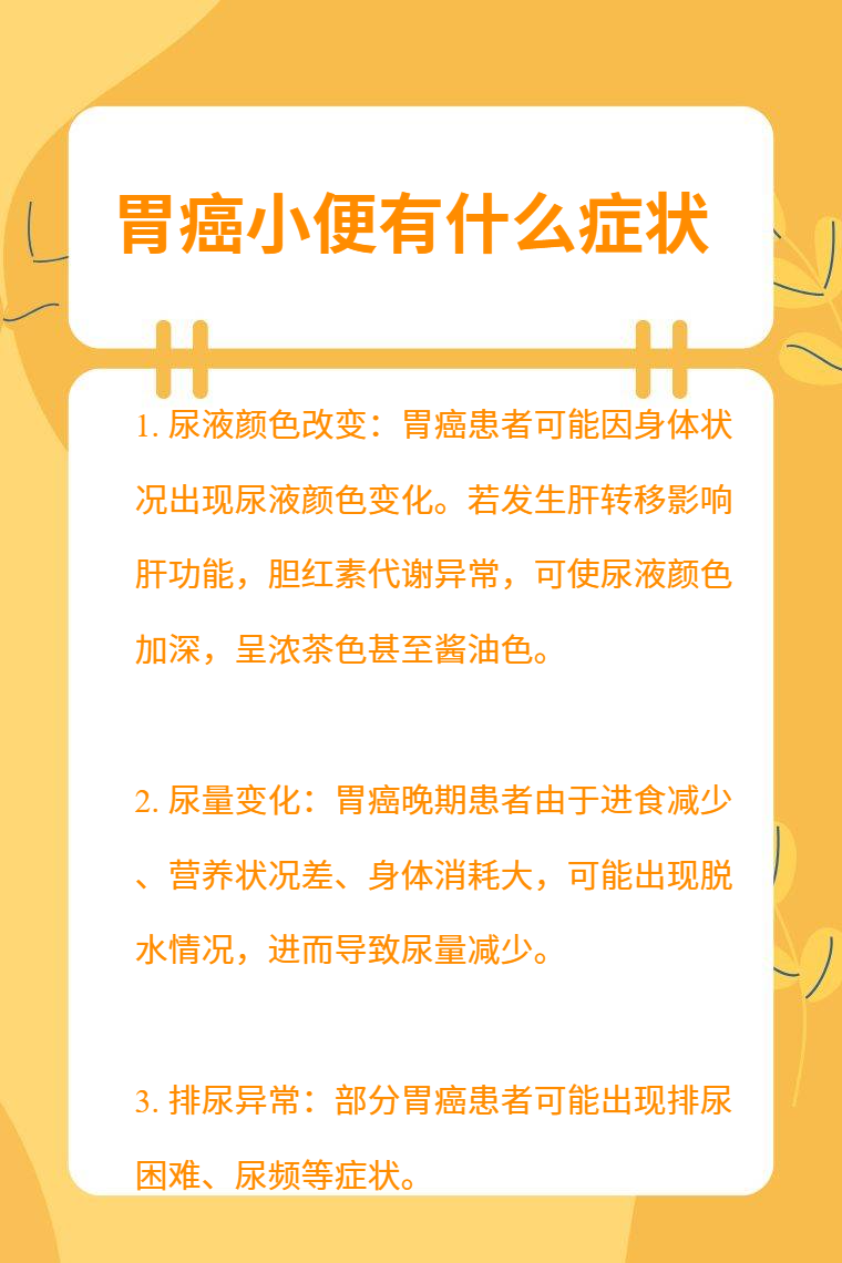 胃癌小便可能出现尿液颜色改变、尿量变化、排尿异常等症状。