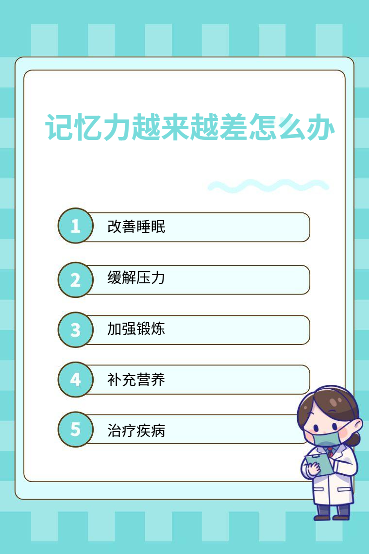 记忆力越来越差可能是睡眠不足、压力过大、缺乏锻炼、营养缺乏、脑部疾病等因素,需要针对病因治疗,可采取的方法有改善睡眠、缓解压力、加强锻炼、补充营养、治疗疾病等。