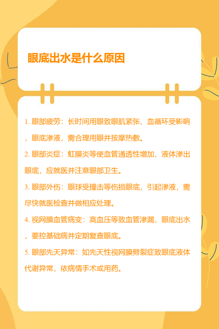 眼底出水常见原因有眼部疲劳、眼部炎症、眼部外伤、视网膜血管病变、眼部先天异常等。