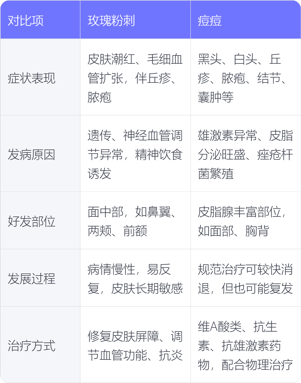 5. 治疗方式:玫瑰粉刺治疗以修复皮肤屏障、调节血管功能、抗炎为主;痘痘治疗则根据不同类型和严重程度,采用维A酸类、抗生素、抗雄激素药物等,还可配合物理治疗。