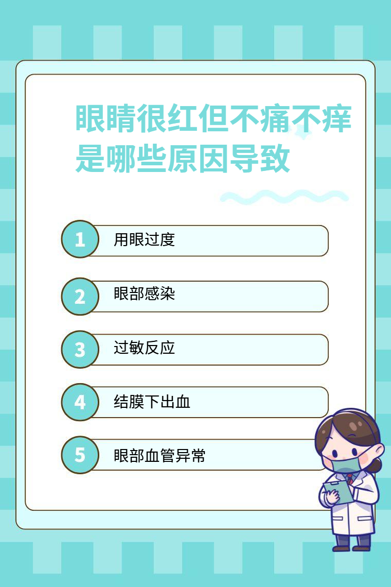眼睛很红但不痛不痒可能由用眼过度、眼部感染、过敏反应、结膜下出血、眼部血管异常等导致。