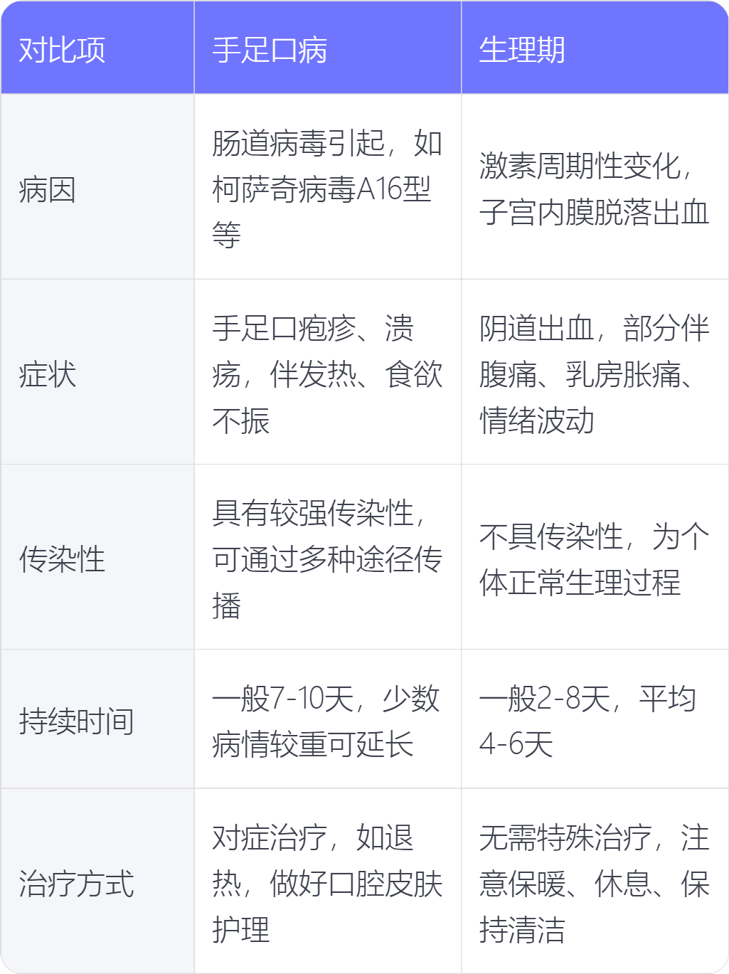 手足口病和生理期在病因、症状、传染性、持续时间、治疗方式上存在不同。