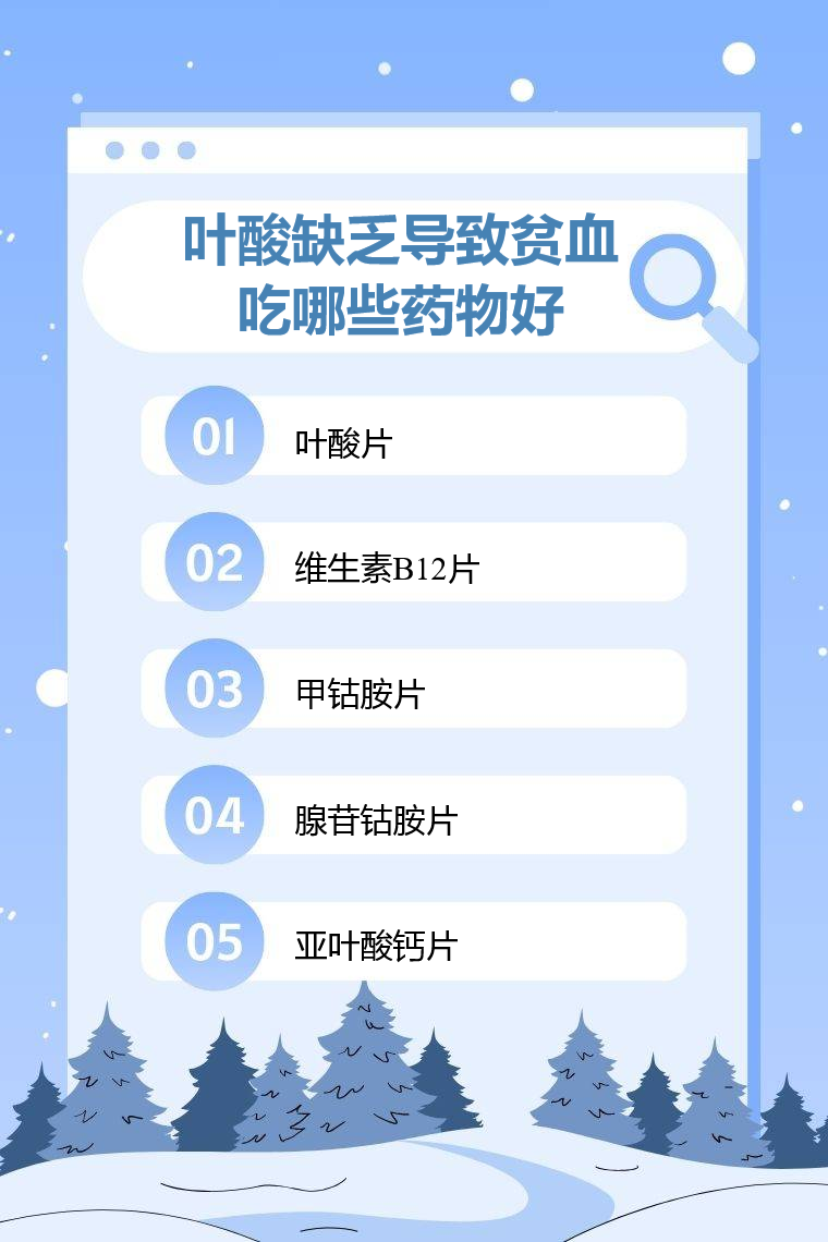 叶酸缺乏导致贫血一般吃叶酸片、维生素B12片、甲钴胺片、腺苷钴胺片、亚叶酸钙片等药物比较好。出现叶酸缺乏导致贫血的情况,务必严格遵医嘱用药,不可自行增减剂量或停药。
