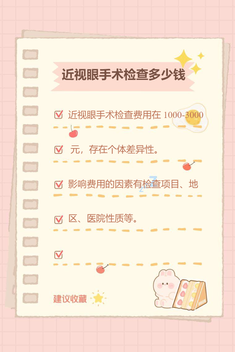 近视眼手术检查费用在 1000 - 3000 元,存在个体差异性。影响费用的因素有检查项目、地区、医院性质等。