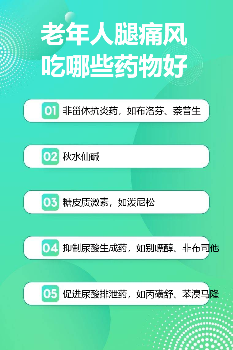 老年人腿痛风可以选择非甾体抗炎药、秋水仙碱、糖皮质激素、抑制尿酸生成药、促进尿酸排泄药等药物比较好。这些药物都应在医生的指导下使用,不可自行随意用药。