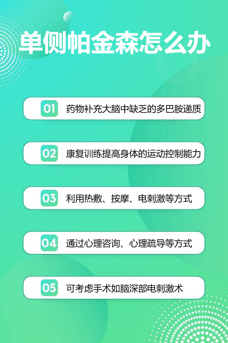 单侧帕金森可通过药物治疗、康复训练、物理治疗、心理干预、手术治疗等方法应对。